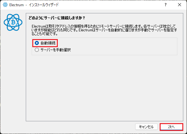 - 「自動接続」で「次へ」ボタンをクリックします。