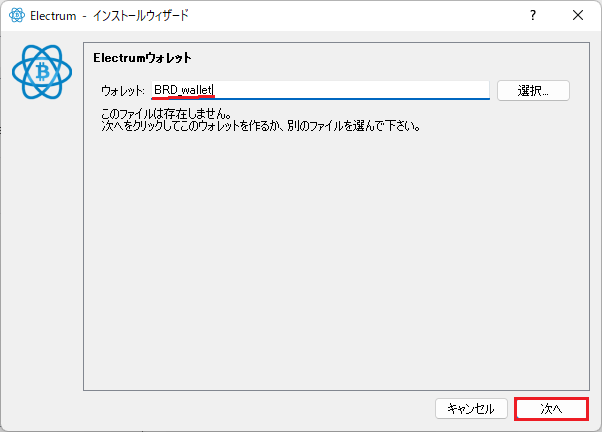 BRDの復元フレーズから取り込むので default_wallet となっているのを、わかりやすくBRD_walletに変更し「次へ」ボタンをクリックしました。