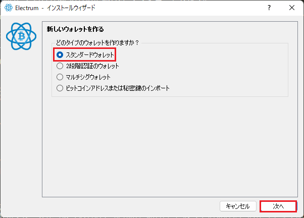 - スタンダードウォレットを選択し「次へ」ボタンをクリックしました。