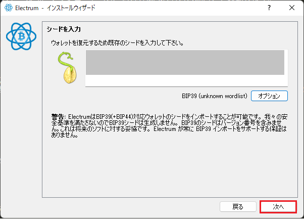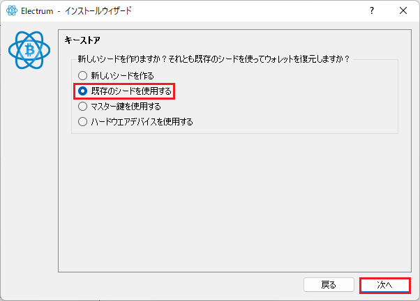 - 「既存のシードを使用する」を選択し「次へ」ボタンをクリックします。