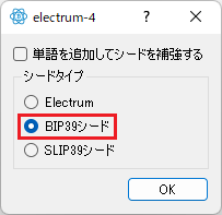 - シードタイプの画面が表示されるので「BIP39シード」を選択し「OK」ボタンをクリックします。