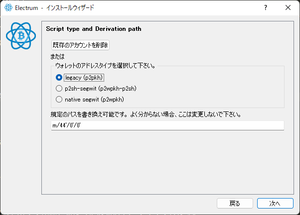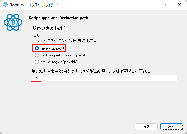- ウォレットタイプを legacy 規定のパスをデフォルトまま m/44'/0'/0' 変更せず「次へ」ボタンをクリックします。