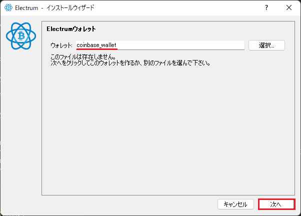 - わかりやすくするため、coinbase_wallet と入力しました。ウォレット名は任意です。