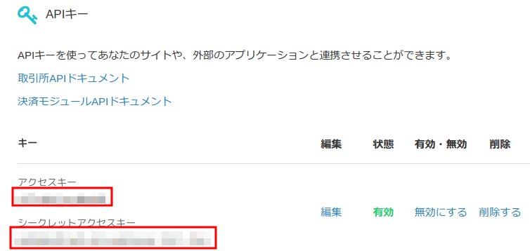 APIキーを作成すると、以下のスクリーンショットのように「アクセスキー」「アクセスシークレットキー」が作成されるので、